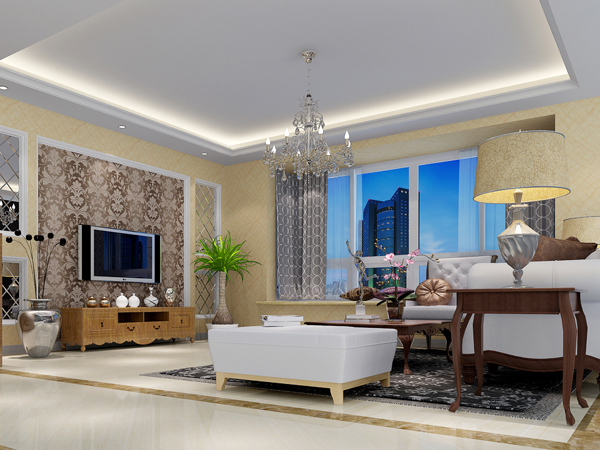 石膏板电视墙造型壁纸为底:电视墙用石膏板做了简单造型,以灰白相间的条纹壁纸为底,挂白色石膏板,格调清雅素净,经济实惠又不失高档典雅的气息。也可以上下部是竖条状色彩相间的壁纸,中间是白色的石膏板,没有复杂的造型,简约高雅,清新明快。或者中间是石膏板,上下部分是素色花纹壁纸,加上白色的大理石地面、白色的布艺沙发,整体充满了时尚现代感,格调清爽素净。